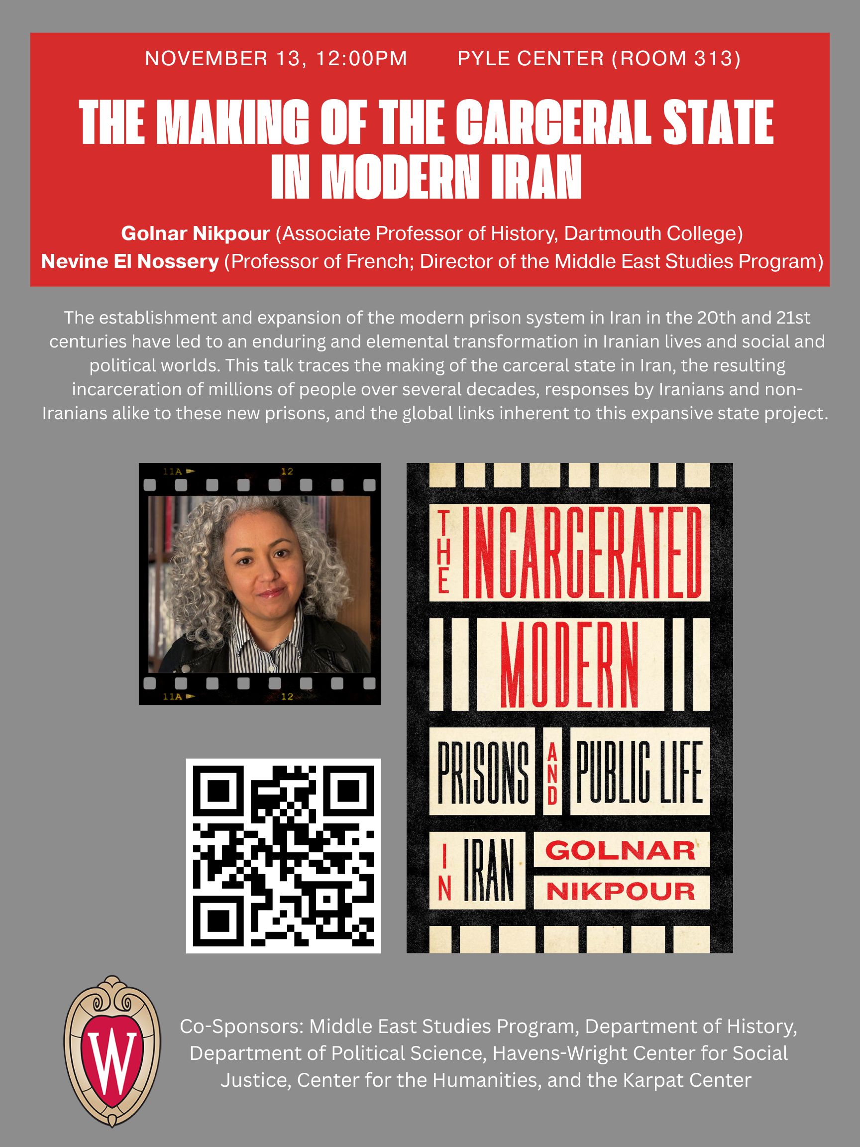 Event Poster: The Making of the Carceral State in Iran with Golnar Nikpour. November 13, 12pm. Pyle Center room 313.A Talk by